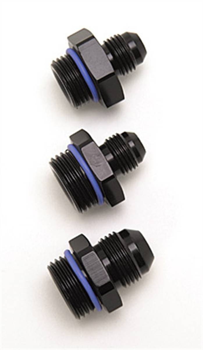 Russell's wide variety of lightweight aluminum adapter fittings allow for the connection of Russell hose ends to almost any component. Adapters are offered in standard thread, metric thread and pipe thread to fit most popular oil pumps, fuel pumps, fuel filters plus a variety of other common components. To compliment the looks of the hose installation, three finishes are available - ultra-bright Endura, traditional blue anodized or our new black anodized fittings.